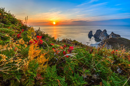 Снято 14 октября 2023 у живописного мыса 4-х скал на восточном побережье чистейшего Японского моря. Живые краски осенних цветов подсвеченные первыми лучами еще теплого солнышка в сочетании с 4-мя чернокаменными скалами и спокойного моря создают удивительное настроение.