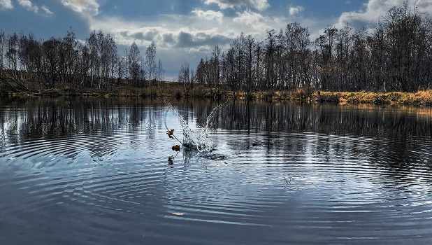 Застыл осенний лес, Отражаясь в зеркальной синеве. В ней слышен чей-то всплеск- и птиц прощальный голос в вышине.