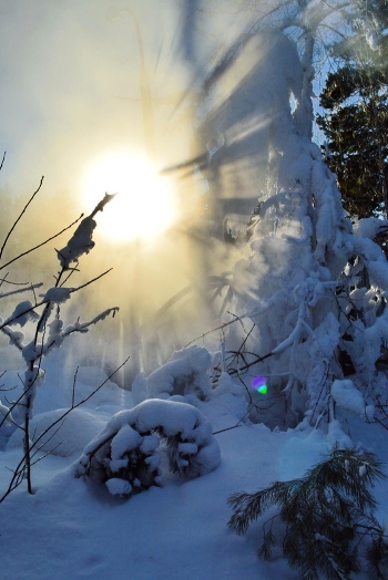 Солнечные лучи сквозь ветки и пар.