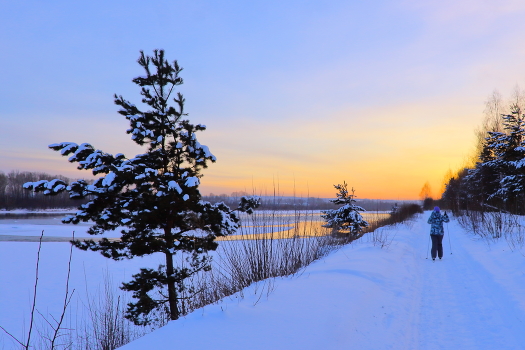 Закат окрасил зимний вечер накануне Рождества
