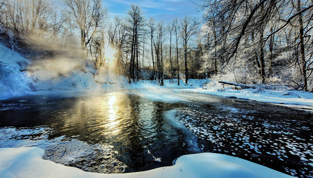 водоём снег деревья лучи солнца небо