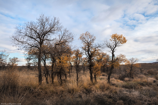 Иногда среди степей и полупустынь Казахстана встречаются туранговые рощи. Туранга - это азиатский вид тополя, приспособленный к жаркому засушливому климату. Дерево вполне комфортно чувствует себя на песчаных и засоленных почвах. В октябре туранги, как и многие другие лиственные деревья, облачаются в золотые наряды. Это, безусловно, лучшее время для посещения туранговых рощ. Однако, даже в ноябре многие деревца всё ещё стоят в осенних одежках