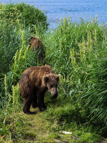 Медвежонка заинтересовал кусочек дерева, вынесенный на берег большой водой.
