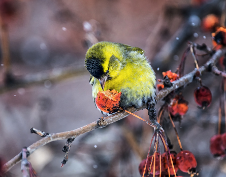 достаёт семена из ранеток мартовских. Мякоть плода его не интересует.