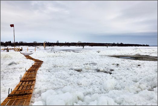 Апрель. Переправа из Архангельска на острова. Под деревянными мостками ледяная крошка - это канал во льду для прохода кораблей в архангельский порт. Так что под этими ледышками весьма не маленькая глубина. Некоторые опасаются здесь ходить, но островитяне люди привычные, многие в городе работают и каждый день преодолевают этот путь в обе стороны.