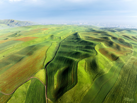 Засеянные поля на холмах к югу от Бишкека