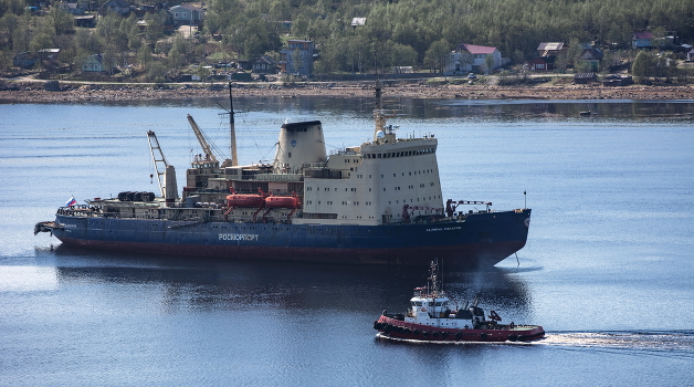 вернувшийся из арктических широт ледокол на рейде в Кольском заливе
