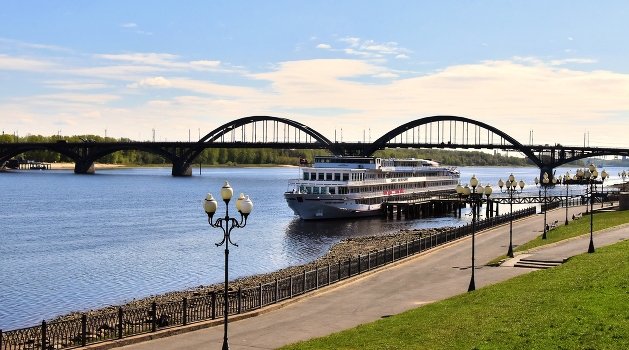 Рыбинск. Мост и теплоход у причала. Весна.