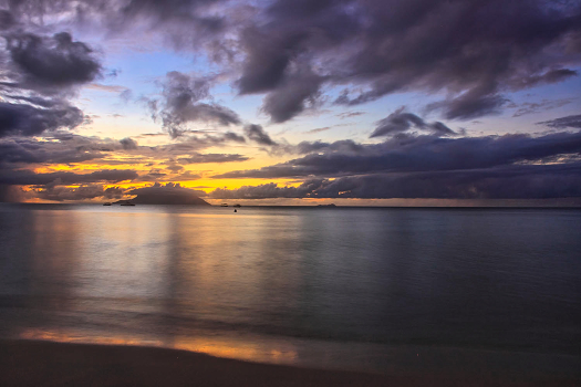 Сейшелы, остров Мае. Вечер на пляже Бу Валон с видом на остров Силуэт