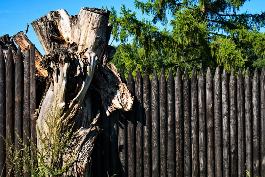 Моё внимание привлёк живописный объёмный, вросший в частокол огромный пень, то ли захваченный в плен забором и пытающийся вырваться на свободу, то ли стоящий в одном ряду с этой изгородью, придающий ей стабильности и монументальности. А сама изгородь поразила рисунком и текстурой древесины. Этот частокол, пень, а за ними сосна и далёкий лес создавали сказочное, непередаваемое фотографией впечатление. Сделал несколько кадров. Буду дома, попробую обработать в редакторе.