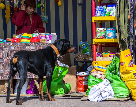 Однодневный рынок в достаточно отдалённом посёлке Новгородской области. Доберман без хозяина бродит по рынку, но явно знает, где и что продают...