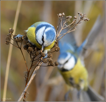 Синица лазоревка нашла в соцветии личинку мухи