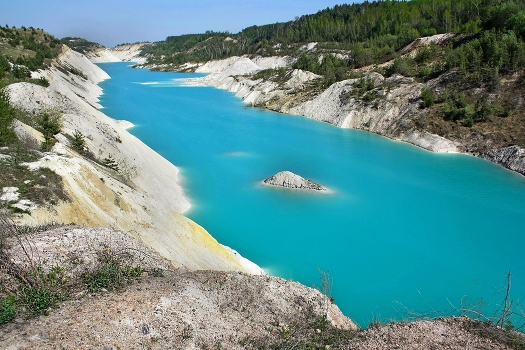 Оставленный меловой карьер под Красносельским. Цвет воды бирюзовый. Есть меловые аарьеры с зелёным цветом воды.
