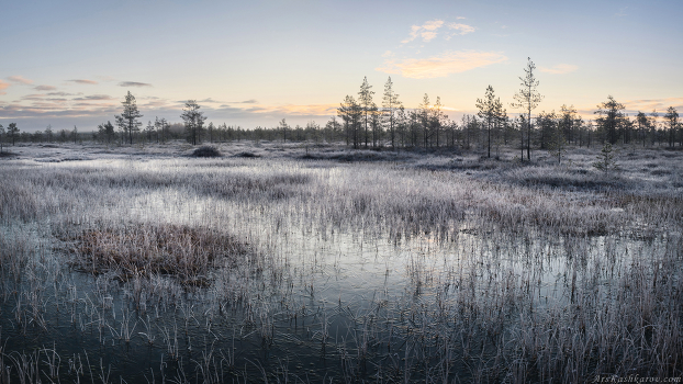 С началом осенних заморозков топи преображаются. Снега ещё нет, но мхи и травы промерзают, водная поверхность подергивается тонким слоем фактурного льда