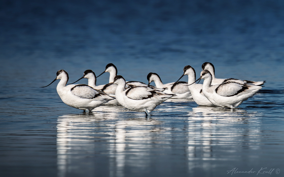 Группа шилоклювок, отдыхающих на пролете на одном из мелководных лиманов в окрестностях Анапы.
