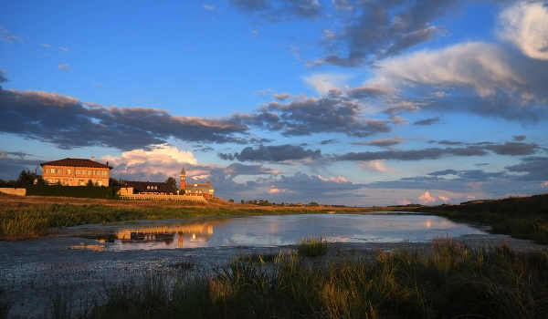На закате.