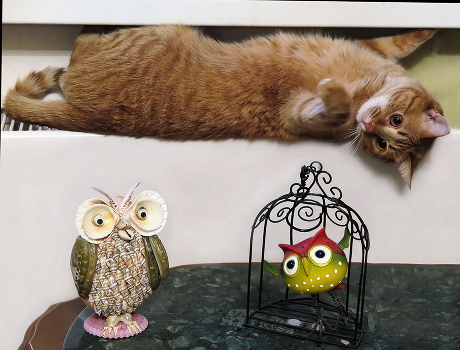 Our cat likes this pose on the under-window heater battery; but how to play at the same time if there are only souvenir owls within his reach :))