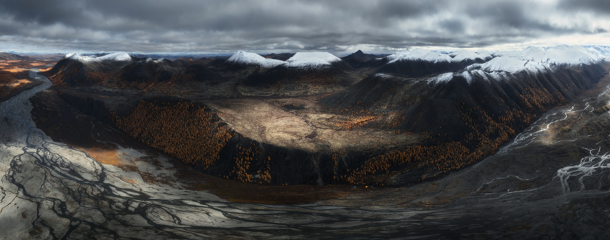 Место нашей стоянки. Бургали (река) обняла наш лагерь, прижала к горе и не хотела отпускать. И только благодаря Сергею Карпухину мы покинули эту красоту вовремя. Республика Саха (Якутия). Оймяконский улус. Хребет Сунтар-Хаята. В верховьях реки Бургали. 10 сентября 2024