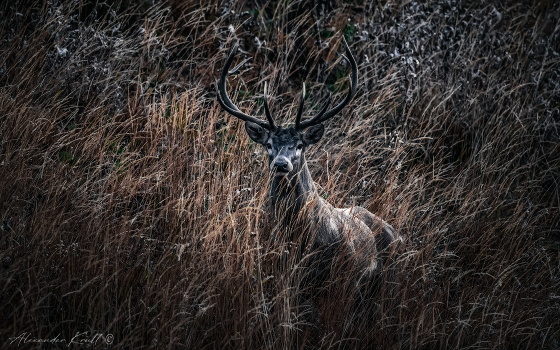 Осень в горах Карачаево-Черкессии. Еще вечером, становясь на ночлег на границе альпийской зоны и густого дремучего пихтарника я слушал, как с разных сторон ниже по склону ревут олени, как зовут они друг друга на ристалище. Надеяться на съемку в условиях быстро сгущающихся сумерек было бесполезно, но я все же включил беспроводную колонку и дал оленям какое-то время послушать имеющийся у меня вариант оленьего рёва. Всю ночь они ревели где-то внизу, под отдаленные звуки их мощных глоток я и заснул. А ранним утром, когда совсем рядом раздался мощный рёв, я чуть не подпрыгнул в своем спальнике. Солнце уже встает, но оно еще где-то там, далеко на востоке, только поднимается над горами. А здесь, на склоне, обращенном на запад, еще глубокие утренние сумерки. Я потихоньку расстегиваю палатку и осторожно выглядываю наружу. Вот он, красавец, в какой-то полусотне метров от меня! Бродит по склону в высокой траве и ревёт, ревёт. Пришел таки туда, откуда вечером раздавался голос "соперника"! Как же он великолепен, как же он прекрасен!