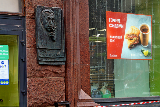 Поэт Роберт Иванович Рождественский жил в этом доме с 1972 по 1994 год. Мемориальная доска на доме 9 по Тверской улице в Москве. Март 2023.