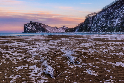 Пляж в бухте Рудной, янв.21. На ЗП мыс Бринера с маяком.