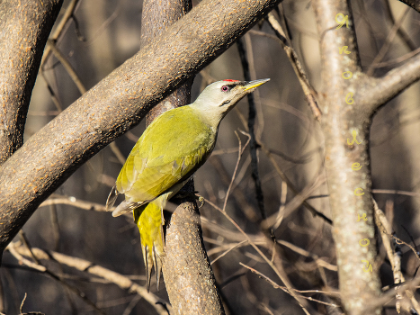 Седой дятел - птица солнечного цвета.