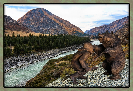 Алтайский сувенир с медведем я купил в Московской комиссионке в далёкое Советское время. Тогда что-нибудь интересное, или импортное можно было увидеть только там и в валютных "Берёзках". Мне понравилась эта поделка. Теперь, побывав на Алтае, решил поместить оба персонажа в родные места - пусть подышат и полюбуются.
