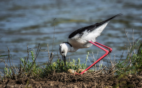 На маленьком островке посреди небольшого водоема ходулочники устроили гнездо. Один из них поправляет яйца в кладке, прежде чем снова улечься на них.