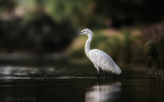 Раннее утро, малая белая цапля охотится.