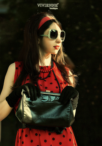 Девушка в красном и черных очках.
