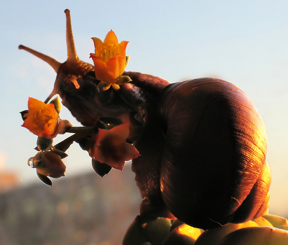 моя ручная улитка ползала по суккуленту, а солнце садилось
