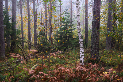 Остатки тумана в утреннем лесу.