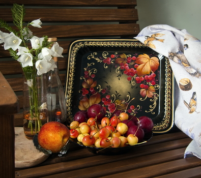 С жостовским подносом, черешней, сливами... Натюрморт на стуле