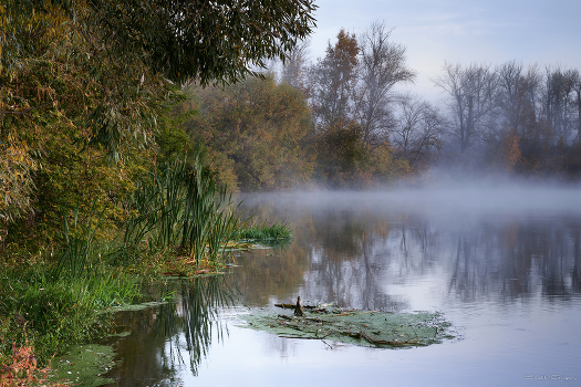 Небо затянуто тучами. Туман стелится по воде...
