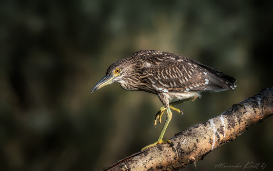 Молодая кваква с утра пораньше расхаживает по нависшей над водой ветви сухого дерева.