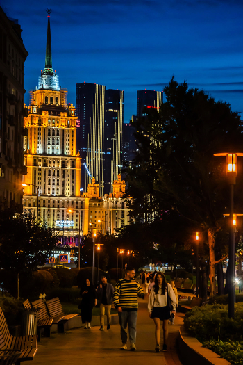 Вечерняя аллея с прохожими на фоне гостиницы "Украина"