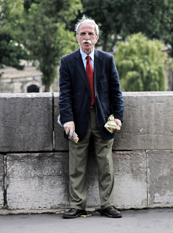 Житель Парижа, перекусывающий багетом на набережной Сены близ собора Парижской Богоматери 26 июня 2013 года.