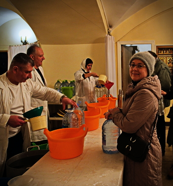 Монастырь. Раздача Святой воды прихожанам после Великого Освящения воды...