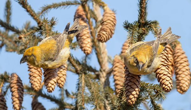 Самки. Самцы яркие, а самок не так просто заметить на елях, тем более птицы на макушках деревьев, т. к. шишки там.