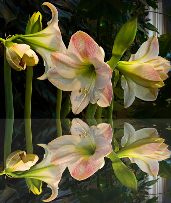 Этюд с отражениями амариллисов. В оранжерее в Царицыно, Москва. (Фон был таким пёстрым, что прекрасные цветы терялись.)
