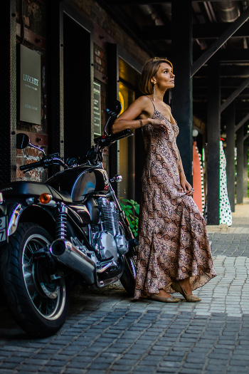 Девушка в платье, стоит облокотившись на мотоцикл.