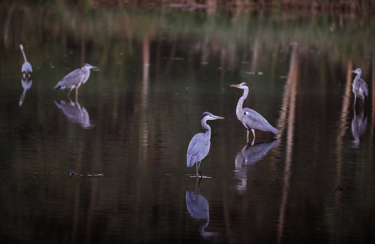 стая серых цапель на мелководье