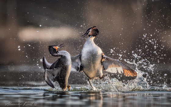 Прошла зима, у больших поганок начался брачный период. Пары разбирают водоемы на участки, где им предстоит охотиться, строить гнездо и растить потомство. Если кто-то из соседей пересекает условную границу участков, то возникает конфликт, в котором более робкий самец предпочитает ретироваться. Но если оба соседа неуступчивы, то будет драка.