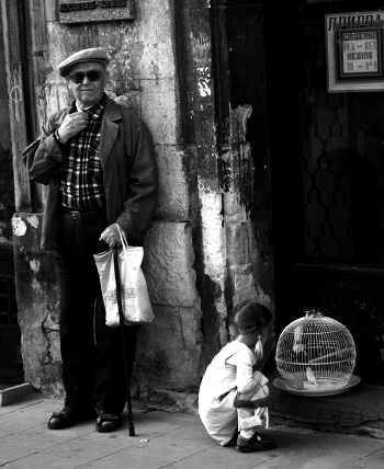 Дедушка, девочка, канарейки