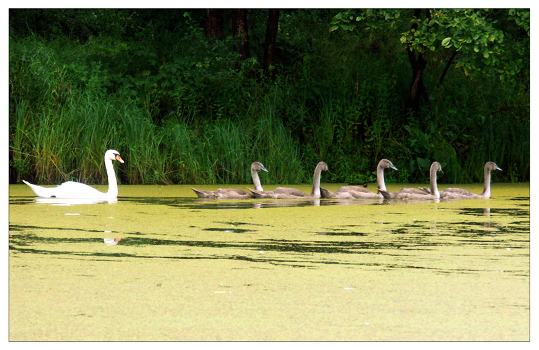 Березина, случайно увидел лебедей, стал медленно подплывать, но они уходили всё дальше в глубь заводи...