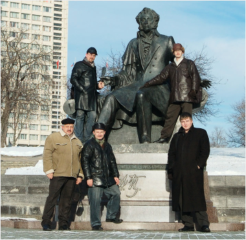 Тем не менее, к окончанию назначенного срока (12.15) - пришли все желающие придти. Итак, в компании с Пушкиным сфотографировались (слева направо): верхний ряд - Юрий Исаревич, Дмитрий Боровский; нижний ряд - Константин Мельник, Владимир Блинов (ваш покорный слуга) и Иван Уральский.