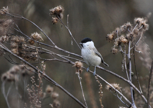 пухляк (буроголовая гаичка) поедает семена репейника