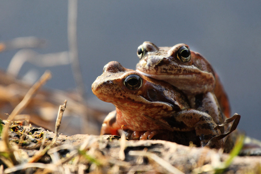лягушки греются под вечерним солнцем на берегу озера