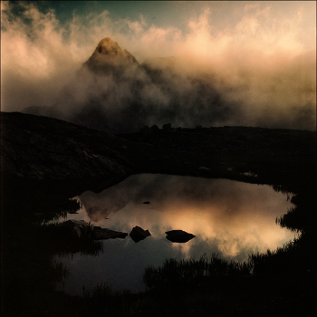 На фотографии небольшая лужица дождевой воды под перевалом Загедан, с которого открывается потрясающий вид на систему из пяти озёр, лежащих чуть ниже. Нам повезло, сразу после подъема наверх из ущелья стали подниматься облака, которые и закрывают пик на снимке.
