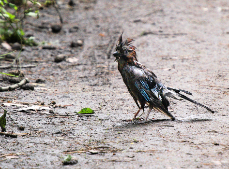 сойка принимала водные процедуры в лесной луже и из красотки превратилось вот в такое жалкое чучелко
